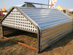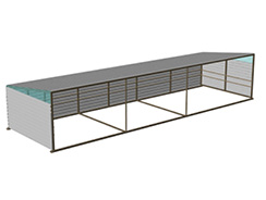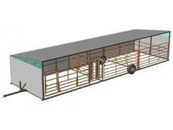 The calf guard package includes a portable building with a removable calf guard. The calf guard is two 40' long pieces of 2-3/8" pipe which slide into the loops on the front of the structure and lock into place using a locking bolt at each end.